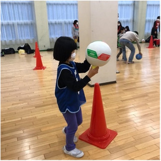 次は、聖火リレー。小さなコーンに、ボールを乗せてバランスをとりながら運びました。